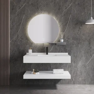 Modern vanities are incorporating LED mirrors with anti-fog technology, built-in USB charging ports, and Bluetooth audio systems, turning a bathroom into a connected tech hub.