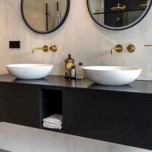 Requires "Rock Slate" surfaces which are scratch-resistant and stain-proof, ensuring the vanity remains in pristine condition despite heavy guest turnover.